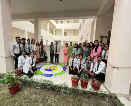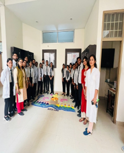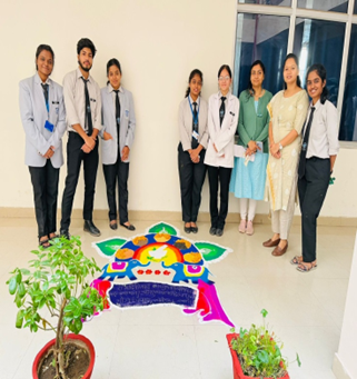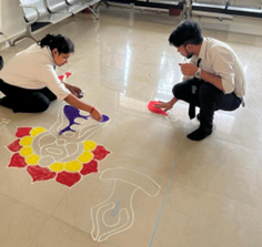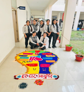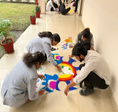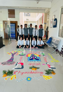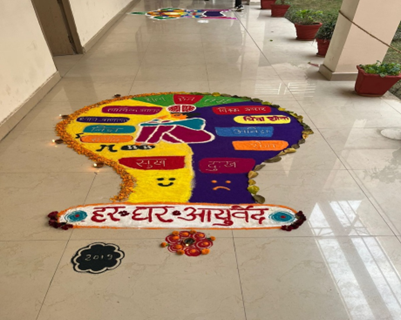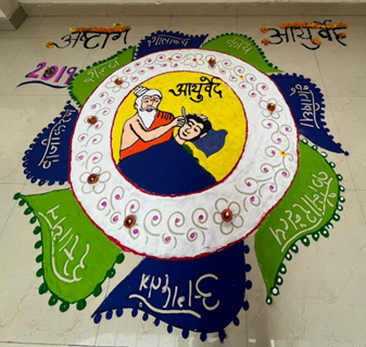 Rangoli competition -: on 05/11/2023. Students from all the batches from 2019 to 2022 participated. Rangoli creates energy pools that guides and uplifts people's positive energy. This Rangoli competition motivated the students to perform and outshine their creative skills and most important work as a team. Students came up with beautiful Rangoli’s that narrated the importance of Ayurved.