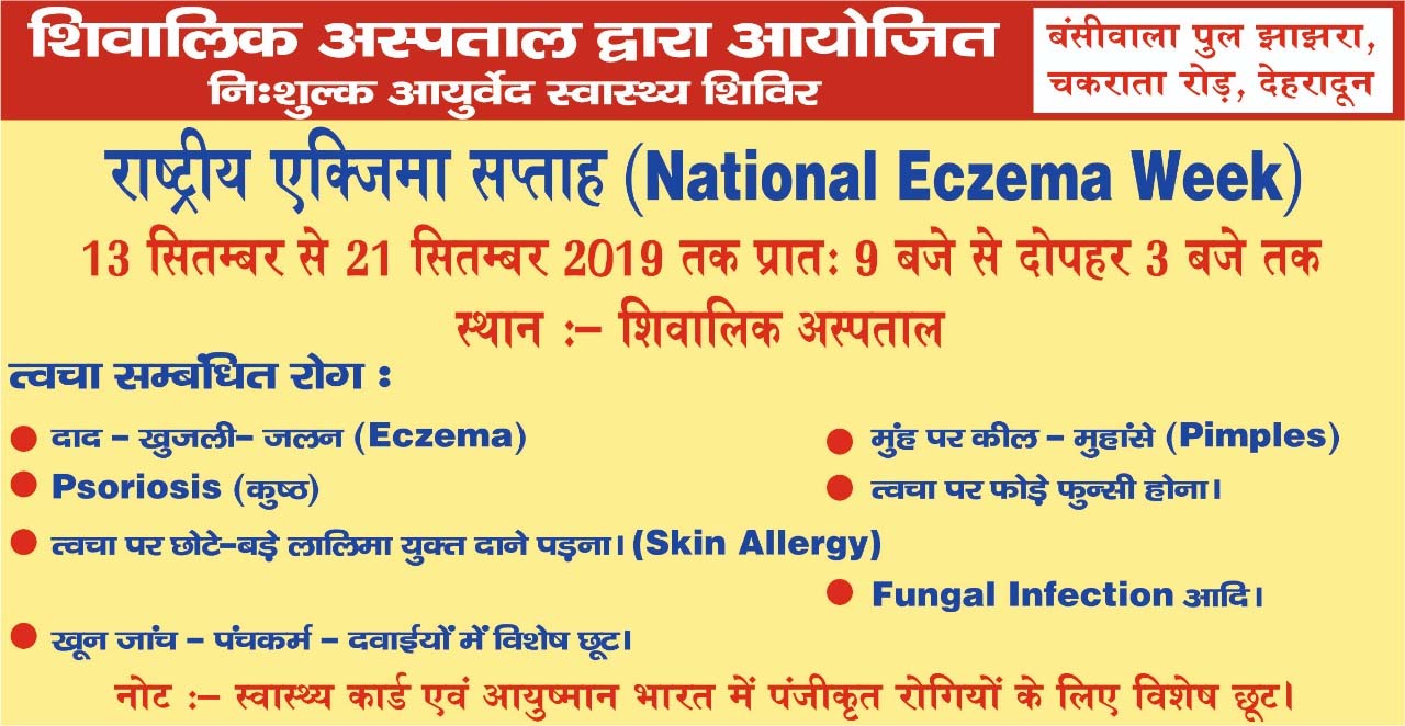 Shivalik Hospital, a unit of Shivalik Institute of Ayurved and Research aspires to provide quality treatment and propagate ayurveda to grass root levels. Keeping this in mind, “National Eczima Week”, was conducted at the hospital from 13/09/2019 to 21/09/2019 which included free consultation, counseling and treatment of various Skin problems like Eczema, Psoriasis, Scabies, Fungal Infections, Allergic dermatitis, Acne, etc.. A number of patients consulted and got benefited from the programme.
