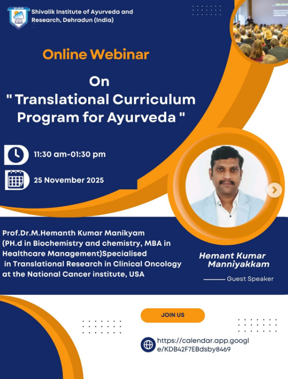 The session was guided by the renowned Ayurveda expert Dr. Hemanth, who is widely recognized for his outstanding contribution to the Translational Curriculum in Ayurveda. The webinar was highly informative and inspired students to explore advanced, practice-oriented learning.