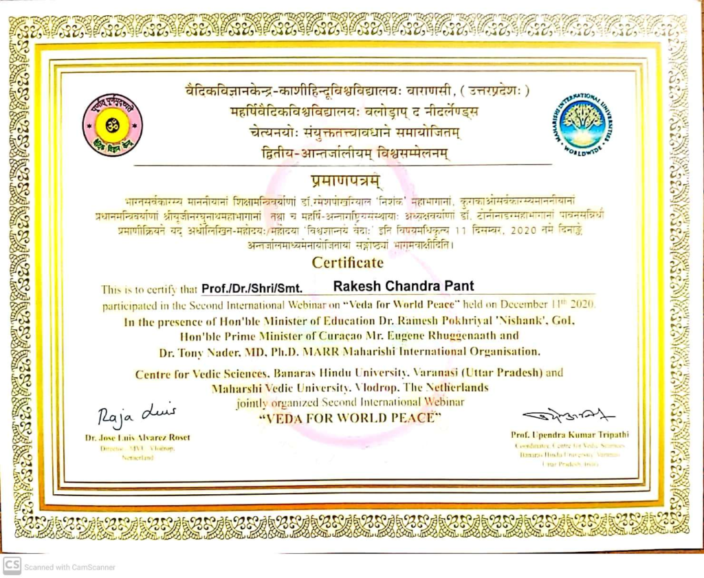 Taking this as a vision a joint venture to conduct a webinar, which was recognized internationally. Centre for Vedic Sciences, Banaras Hindu University, Varanasi and Maharshi Vedic University, Vlodrop, The Netherlands, jointly conducted Second International Webinar on “VEDA FOR WORLD PEACE” on 11th of December, 2020.